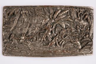 La scène représentée sur la plaque-boucle illustre l’un de ces affrontements. On y distingue plusieurs combattants en action : à gauche des soldats français chargeant à la baïonnette et à droite des combattants insulaires qui surgissent du couvert végétal. La violence du combat est soulignée au centre par l’enchevêtrement de soldats tués ou blessés.